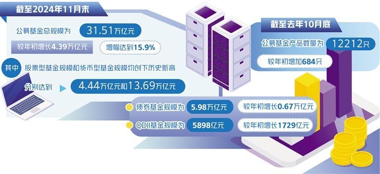 从不同类型基金规模的变化情况看,股票型基金、货币型基金是去年推动公募基金规模增长的“主力军”。截至去年11月末,股票型基金规模和货币型基金规模均创下历史新高,分别达到4.44万亿元和13.69万亿元。同时,债券基金、QDII基金等类型基金规模也有不同幅度的增长,截至2024年11月末,债券基金规模为5.98万亿元,较年初增长0.67万亿元;QDII基金规模为5898亿元,较年初增长1729亿元。