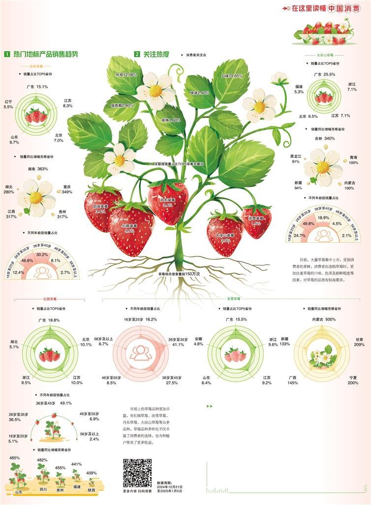 从产地分布看,丹东草莓和大凉山草莓更受消费者青睐。丹东草莓凭借鲜美的口感和丰富的营养走俏市场,湖南、重庆、贵州的消费者买走了更多的丹东草莓;大凉山草莓生长在高海拔地区,这使得草莓的糖分积累更加充分,吉林、青海、内蒙古等地消费者买走了更多大凉山草莓。