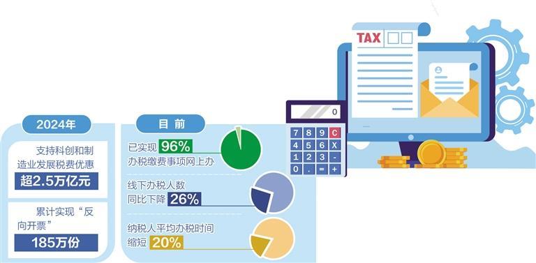 2024年,税务部门扎实推进与多个部门的常态化数据共享,税收大数据体系持续优化。在全国上线统一规范的新电子税务局,创新拓展智能服务场景,实现96%的办税缴费事项网上办,线下办税人数同比下降26%,纳税人平均办税时间缩短20%,切实减轻了“来回跑、排队办”的烦恼。