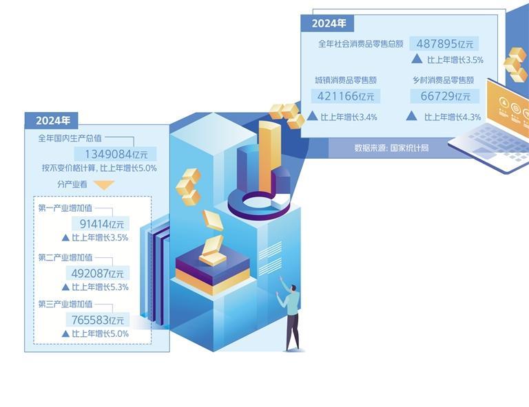 2024年是中华人民共和国成立75周年,是实现“十四五”规划目标任务的关键一年。面对外部压力加大、内部困难增多的复杂严峻形势,一系列旨在推动高质量发展的政策“组合拳”应出尽出,有效提振社会信心,推动经济运行总体平稳、稳中有进。初步核算,全年国内生产总值1349084亿元,按不变价格计算,比上年增长5.0%。分季度看,一季度国内生产总值同比增长5.3%,二季度增长4.7%,三季度增长4.6%,四季度增长5.4%。全年经济社会发展主要目标任务顺利完成。这一成绩在全球范围内表现优异,尤其是在全球经济增长放缓的背景下,展现出中国经济强大的韧性与活力。