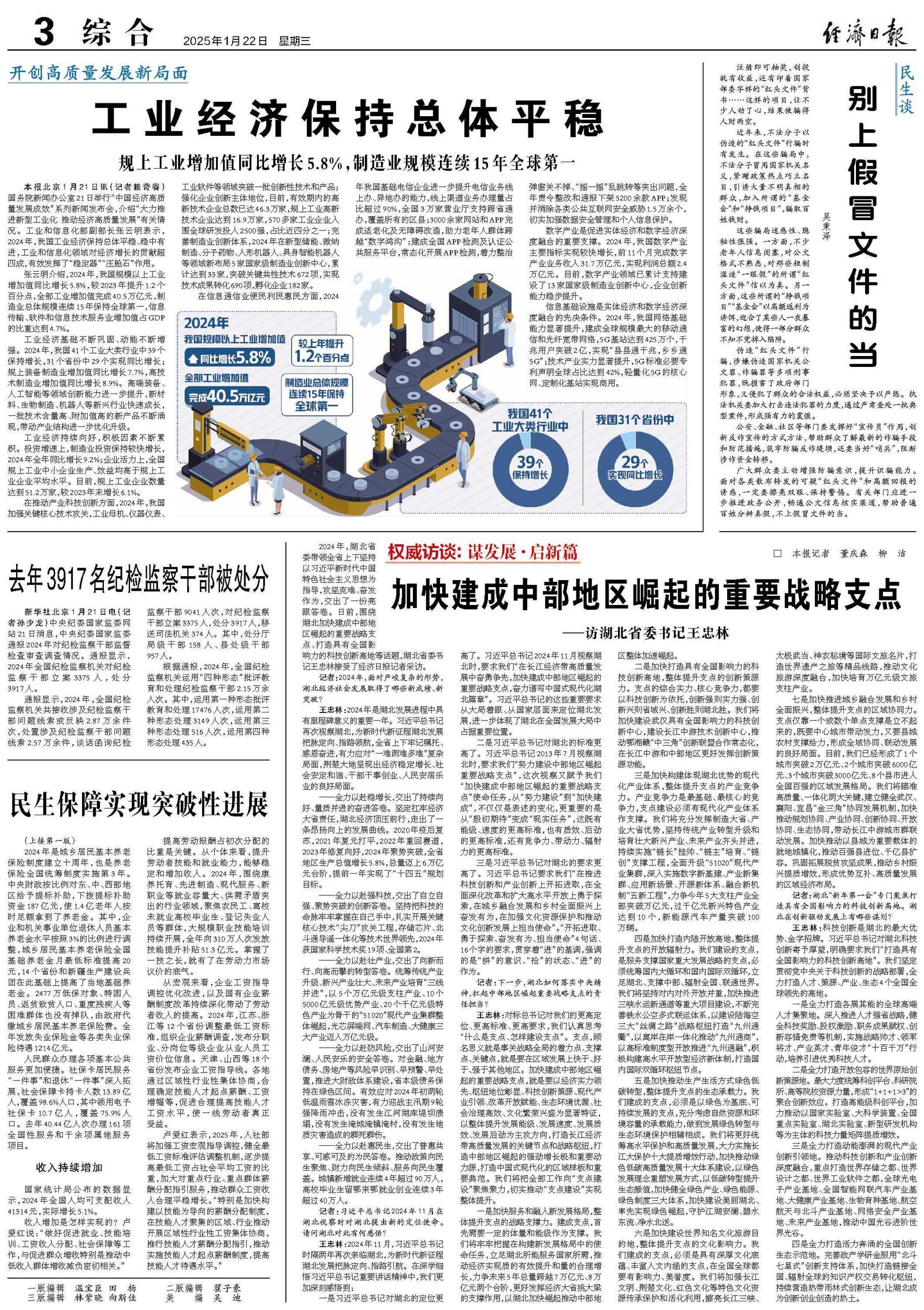 王忠林:2024年是湖北发展进程中具有里程碑意义的重要一年。习近平总书记再次视察湖北,为新时代新征程湖北发展把脉定向、指路领航,全省上下牢记嘱托、感恩奋进,有力应对“一难两难多难”复杂局面,荆楚大地呈现出经济稳定增长、社会安定和谐、干部干事创业、人民安居乐业的良好局面。