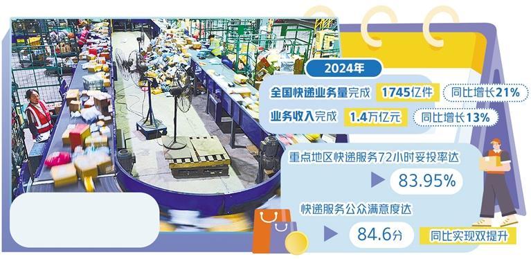 物流是实体经济的“筋络”,联接生产和消费、内贸和外贸。过去一年,邮政快递业聚焦“物畅其流”的美好愿景,更好赋能实体经济发展,行业规模再创历史新高,对经济社会发展的促进作用不断增强。数据显示,2024年快递业务量和业务收入分别完成1745亿件和1.4万亿元,同比分别增长21%和13%。
