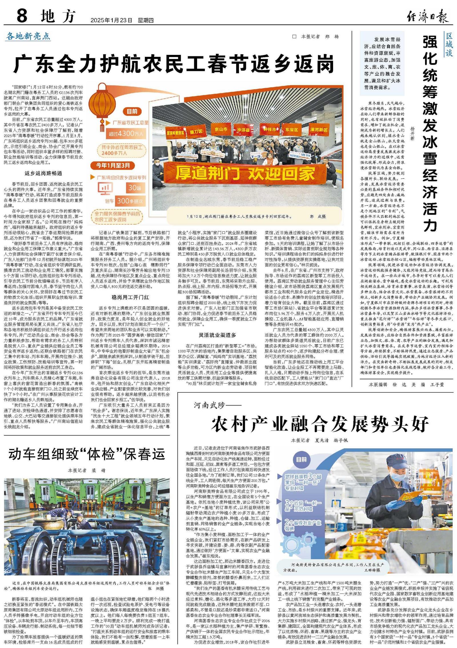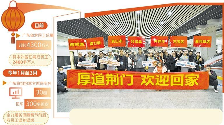 目前,广东省农民工总量超过4300万人,其中外省在粤农民工2400多万人。记者从广东省人力资源和社会保障厅了解到,随着2025年“南粤春暖”行动拉开序幕,1月至3月,广东将组织返乡返岗专列30趟、包车300多班次,示范引领企业、商会、协会广泛开展专列包车等活动,同时组织丰富多样的招聘对接、职业技能培训等活动,全力保障春节前后农民工返乡返岗和企业用工。