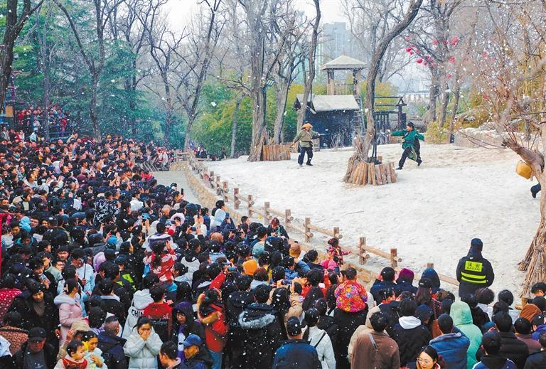 ▼2024年2月10日,正月初一,河南省开封市万岁山大宋武侠城景区的风雪山神庙演出现场座无虚席。