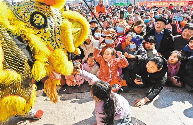 ◀2024年2月25日,孩子们在山东省滕州市民间游艺展演活动现场观看舞狮表演。