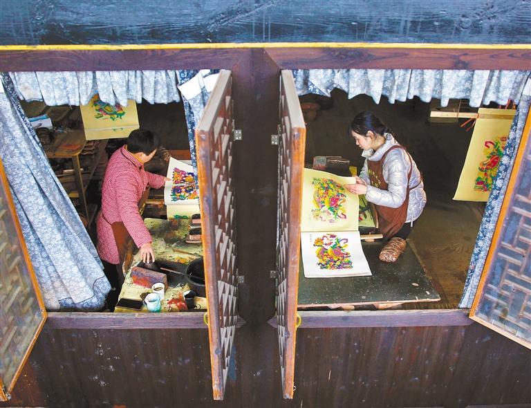 ▲2024年1月25日,湖南省邵阳市隆回县滩头镇福美祥年画作坊,年画艺人在印制年画。