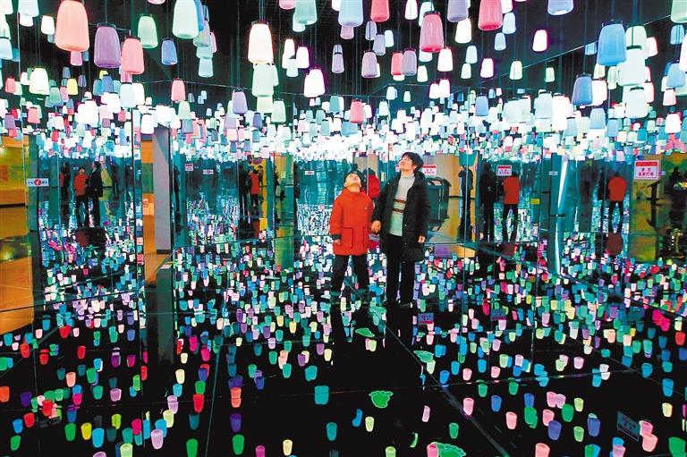 ▼2024年2月17日,游客在山东省科技馆“灯森林”空间参观体验。