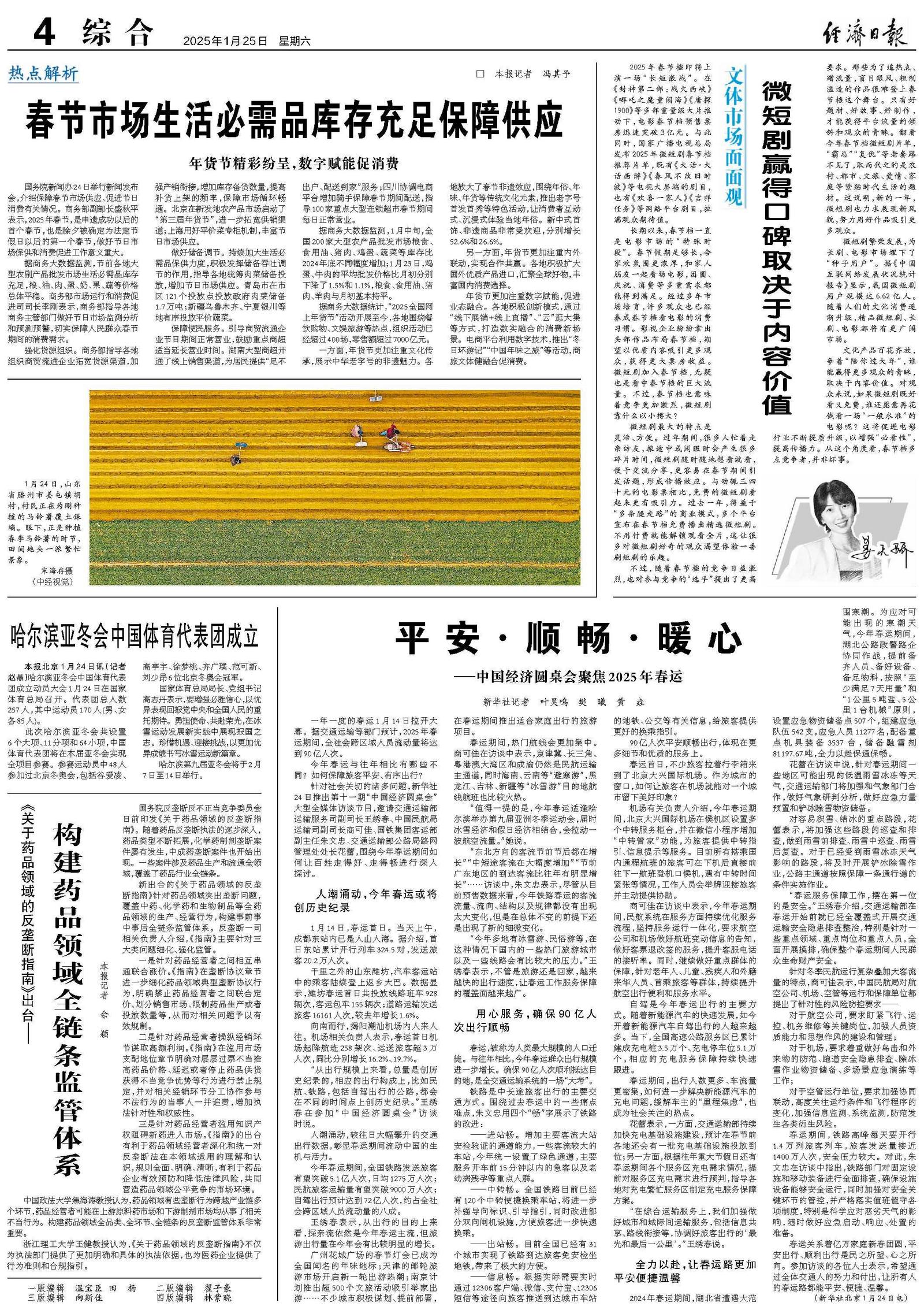 不过,随着春节档的竞争日益激烈,也对参与竞争的“选手”提出了更高要求。那些为了追热点、蹭流量,盲目跟风、粗制滥造的作品很难登上春节档这个舞台。只有好题材、好故事、好制作,才能获得平台流量的倾斜和观众的青睐。翻看今年春节档微短剧片单,“霸总”“复仇”等老套路不见了,取而代之的是农村、都市、文旅、爱情、家庭等紧贴时代生活的题材。这说明,新的一年,微短剧也力求展现新风貌,努力用好作品吸引更多观众。