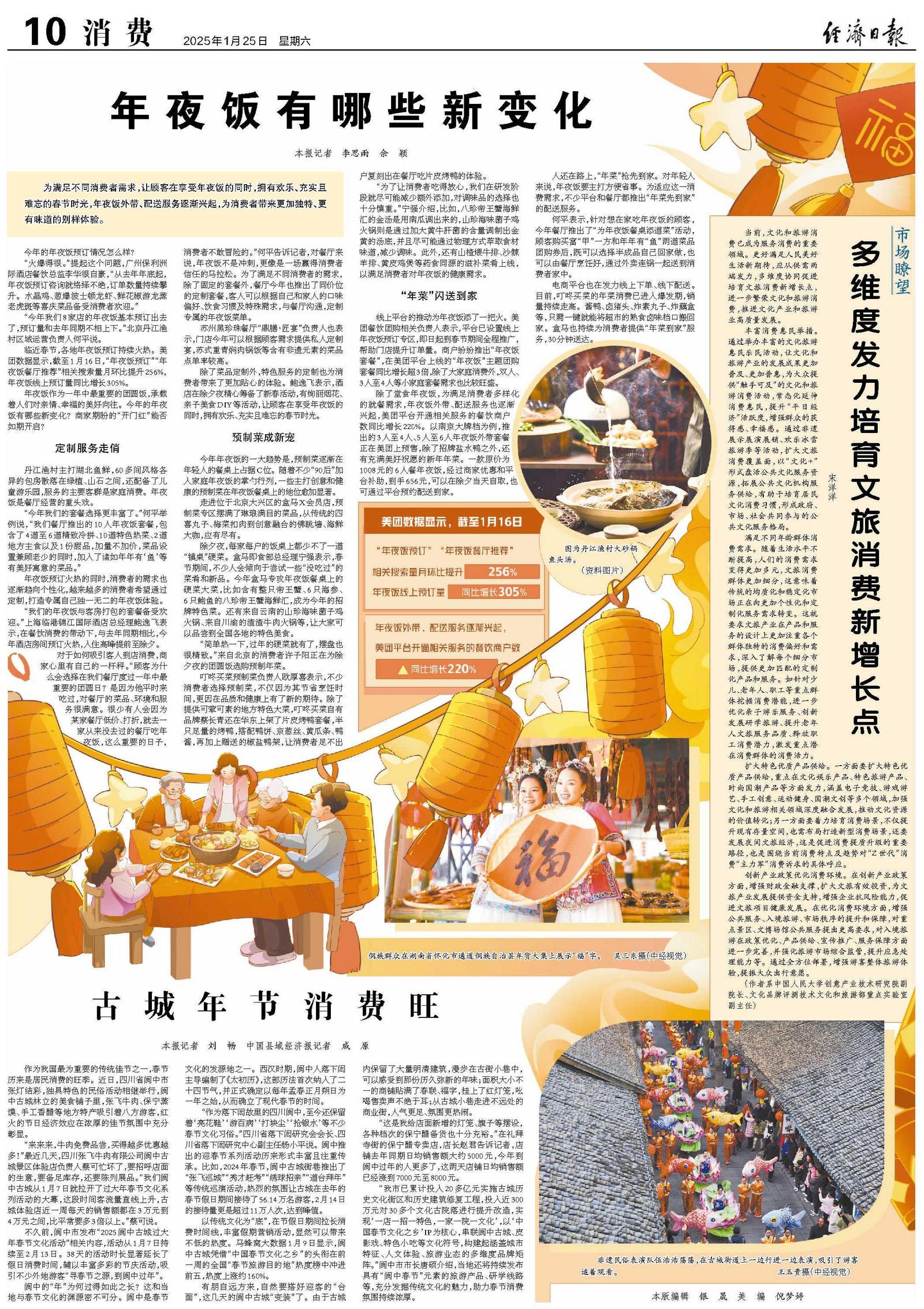 线上平台的推动为年夜饭添了一把火。美团餐饮团购相关负责人表示,平台已设置线上年夜饭预订专区,即日起到春节期间全程推广,帮助门店提升订单量。商户纷纷推出“年夜饭套餐”,在美团平台上线的“年夜饭”主题团购套餐同比增长超3倍,除了大家庭消费外,双人、3人至4人等小家庭套餐需求也比较旺盛。