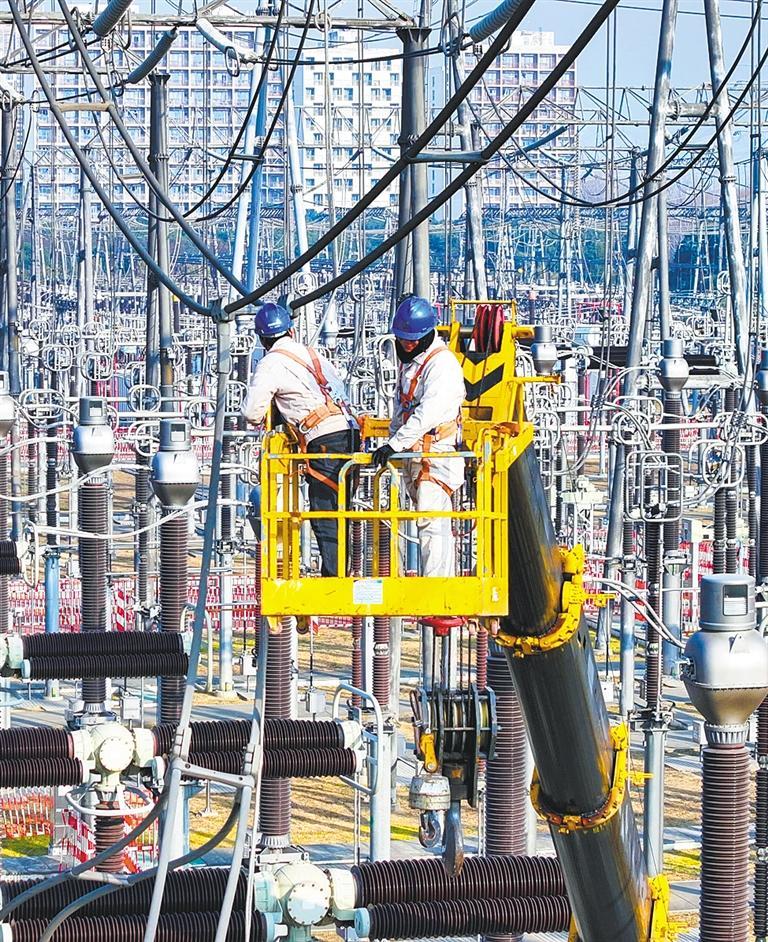 近日,江苏苏州车坊500千伏变电站超规模扩建工程现场,江苏省送变电有限公司施工人员趁春节前的电力负荷低谷期,对电气设备进行升级改造。史 俊摄(中经视觉)