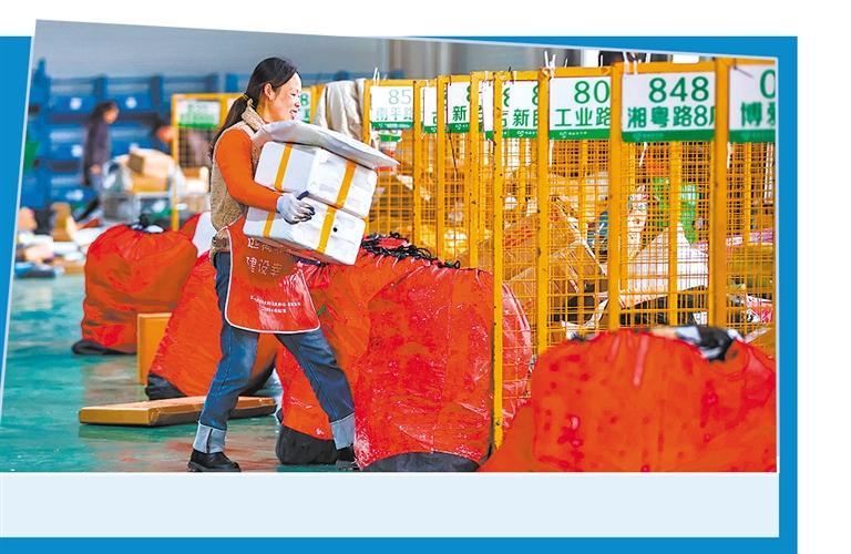 湖南省永州市蓝山县创品国际智慧物流园,工作人员在分拣快递。