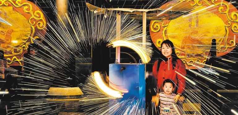 ▲2024年2月14日,游客在山东省临沂市郯城县郯国古城景区体验“打铁花”。