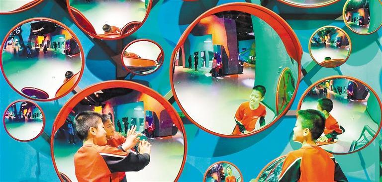 ▼2024年2月14日,小朋友在山东青岛西海岸科技馆探索“镜子的秘密”。