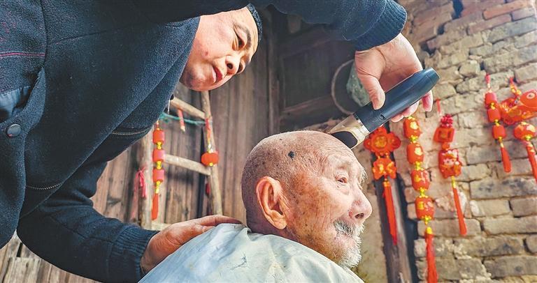 ◀2024年2月15日,湖北省孝感市云梦县伍洛镇大张村,黄青云为107岁的祖父黄明道理发,让老人享受亲情。