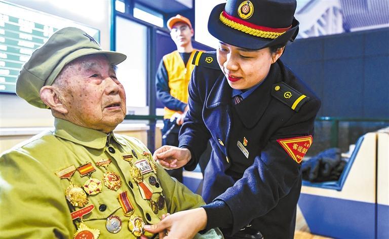 ◀2024年2月4日,“百岁老兵”江春太乘坐高铁回乡探亲。
