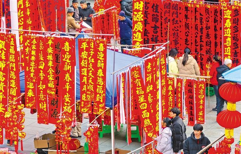 1月26日,重庆市南川区东城街道鼓楼广场洋溢着浓浓的节日气氛,众多市民前来选购春联、灯笼以及各类年货饰品,共同迎接新春佳节。