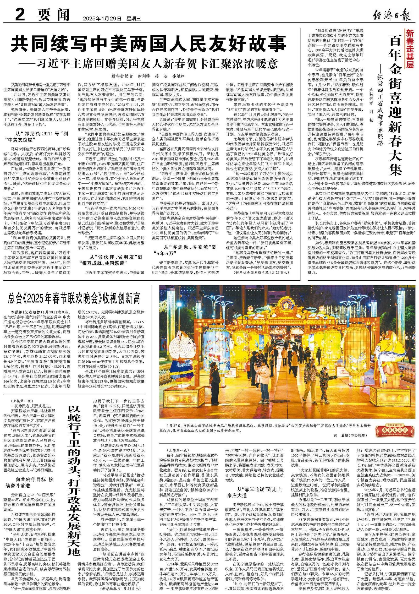 本报讯(记者敖蓉)1月28日晚8点,在“欢乐吉祥、喜气洋洋”的主基调中,中央广播电视总台《2025年春节联欢晚会》以“巳巳如意,生生不息”为主题,用满屏新意奉上一道充满欢声笑语的文化大餐,向海内外受众送上乙巳蛇年的真挚祝福。