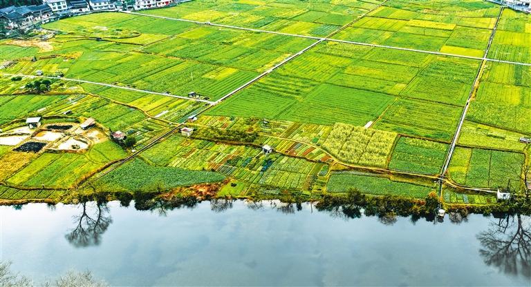 2月3日,湖南省怀化市通道侗族自治县万佛山镇临口村,成片的油菜花相继绽放,村庄、河流点缀其间,呈现出一片生机盎然景象。