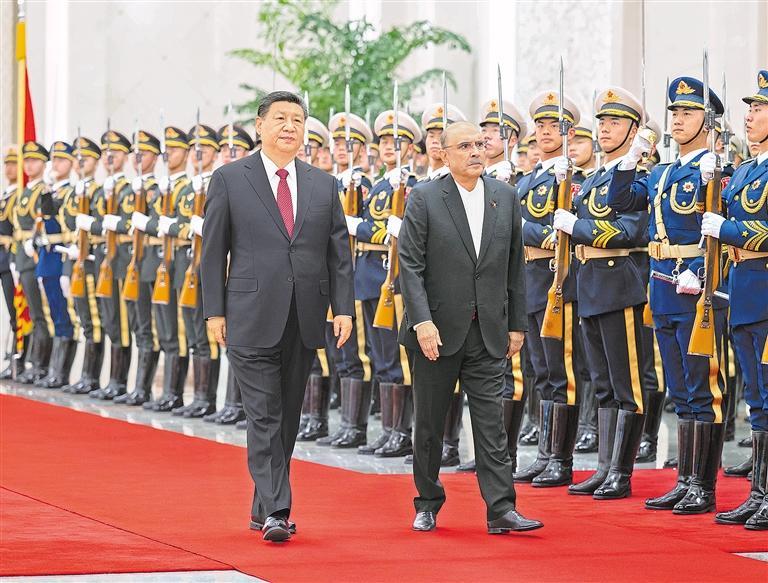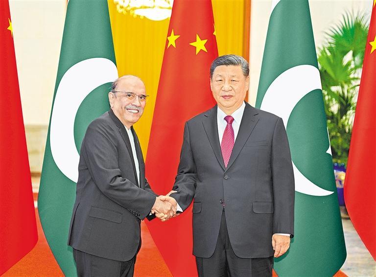 扎尔达里表示,巴基斯坦和中国是亲密邻邦,更是全天候的好朋友、好伙伴。巴中友谊历经风雨,两国人民的心始终紧紧相连。无论形势如何变化,巴方都将毫不动摇同中方站在一起。巴方感谢中方为巴经济社会发展提供无私帮助,愿学习中国成功经验,推动中巴经济走廊和各领域合作高质量发展,助力巴基斯坦实现工业化和现代化。在习近平主席英明指引下,中国在国际事务中发挥越来越大的引领作用,日益成为维护世界和平、稳定、繁荣的重要力量。巴方愿同中方密切配合,坚持多边主义,维护自由贸易,促进两国和广大发展中国家的共同利益。