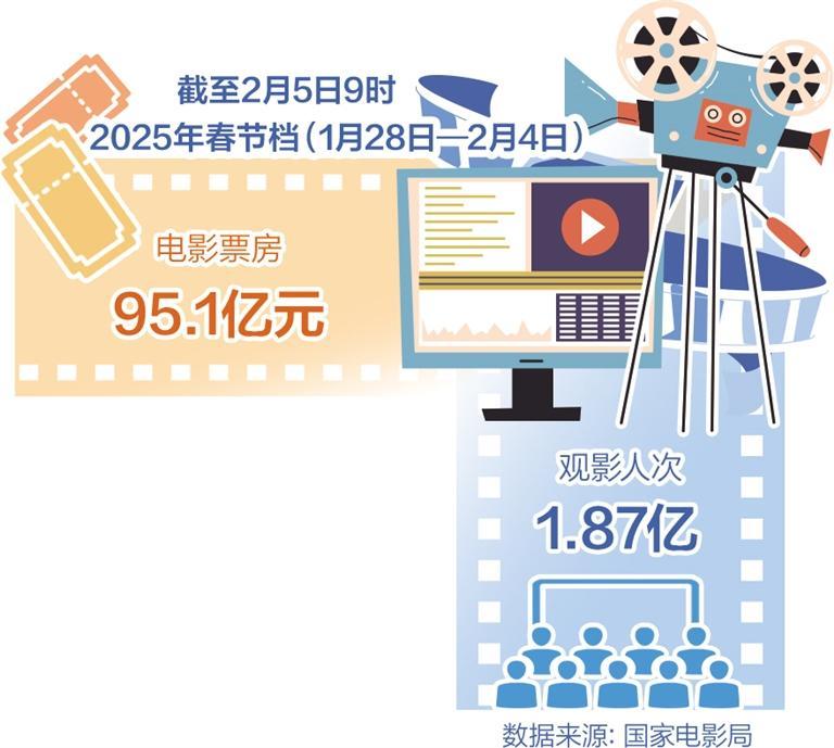 春节假期期间,电影市场迎来一年一度的观影热潮。据国家电影局统计,截至2月5日9时,2025年春节档(1月28日—2月4日)电影票房达95.1亿元,观影人次为1.87亿,创造了新的春节档票房和观影人次纪录。另据网络平台数据,截至2月5日13时29分,2025年春节档上映新片总票房(含点映及预售)突破100亿元。