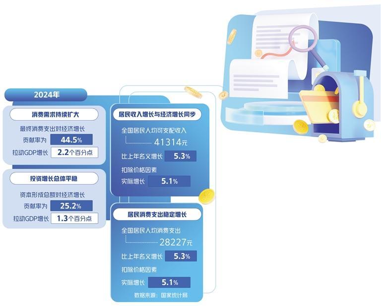 消费作为最终需求,带动了生产和投资,也连接着供给和需求,事关就业民生和社会福利,对畅通经济循环起着至关重要的作用。中央经济工作会议提出,大力提振消费、提高投资效益,全方位扩大国内需求。2024年,最终消费支出对经济增长贡献率为44.5%,拉动GDP增长2.2个百分点,明显高于资本形成总额对经济增长25.2%的贡献率,消费日益成为拉动经济增长的基础性力量。但也要看到,当前经济运行面临的困难挑战主要是有效需求不足,经济政策的着力点需要更多转向扩内需、促消费,以提振消费为重点扩大国内需求,加快培育完整内需体系,推动经济持续向好。