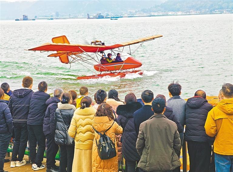 ▼2月4日,游客在四川省阆中市嘉陵江旅游度假区体验低空观光。