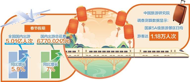 经文化和旅游部数据中心测算,春节假期8天,全国国内出游5.01亿人次,同比增长5.9%;国内出游总花费6770.02亿元,同比增长7%。专家表示,春节假期奠定了全年旅游经济高开高走的市场基础,有力提振了建设旅游强国和高质量发展的信心。