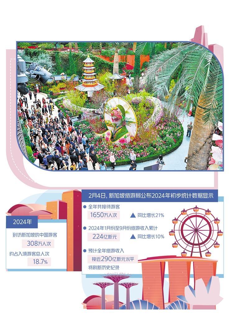 2月4日,新加坡旅游局公布2024年初步统计数据显示,全年共接待游客1650万人次,同比增长21%。其中来自中国的游客数量排名第一,达308万人次,同比增长约126%,已经恢复至2019年约85%的水平。2024年1月份至9月份的旅游收入累计224亿新元,同比增长10%,预计全年旅游收入将刷新历史纪录,接近290亿新元水平。