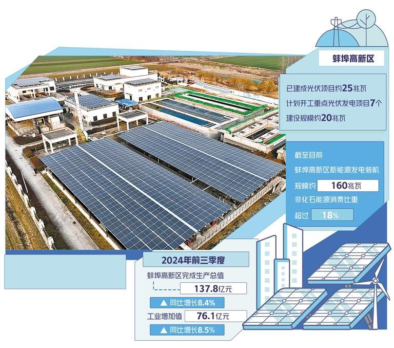 走进蚌埠高新区,记者看见公路两侧的厂房上铺放着一排排光伏发电板,正将一缕缕阳光转化为绿电,为企业绿色低碳发展注入源源不断的动力。