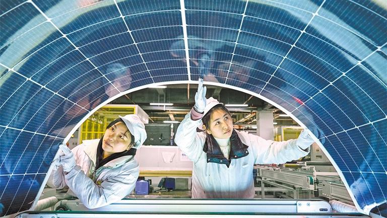 ▼2月5日,安徽省合肥庐阳经济开发区大恒能源科技有限公司,工人在检测光伏柔性组件质量。