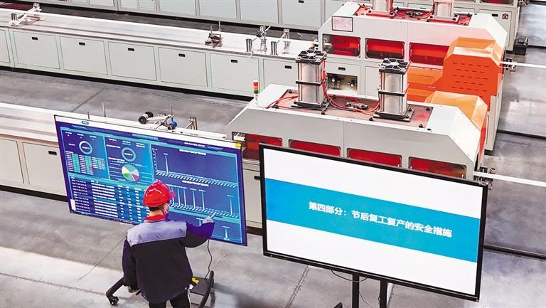 ▲2月5日,位于江苏连云港经济技术开发区的中复碳芯电缆科技有限公司,工人在车间查看数字化玻璃纤维拉挤板材生产线运行情况。
