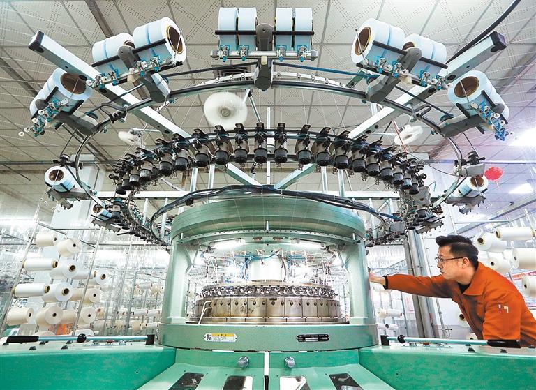 ▲2月5日,山东青岛即墨区即发集团有限公司的员工在生产面料。