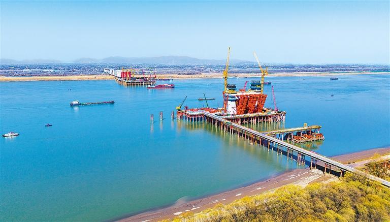 二月九日,安徽省池州市,建设中的池州长江公铁大桥。该桥按照“公路+城际铁路+城市轨道交通”合并过江的标准建设,对于完善区域交通布局具有重要意义。刘伯顺摄(中经视觉)