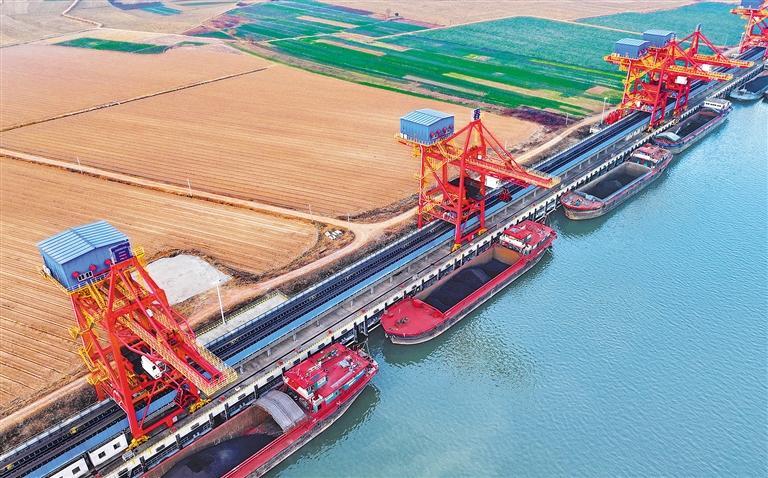 二月九日,江西省宜春港丰城港区尚庄货运码头,桥吊起重机在吊运电煤。春节后当地铁路港、码头等有序调配电煤运输,确保用电稳定供应。朱海鹏摄(中经视觉)