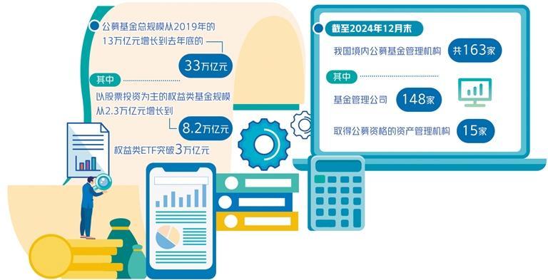 近年来,公募基金行业整体上保持稳健发展的态势。总规模从2019年的13万亿元增长到去年底的33万亿元。其中,以股票投资为主的权益类基金规模从2.3万亿元增长到8.2万亿元,权益类ETF突破3万亿元。