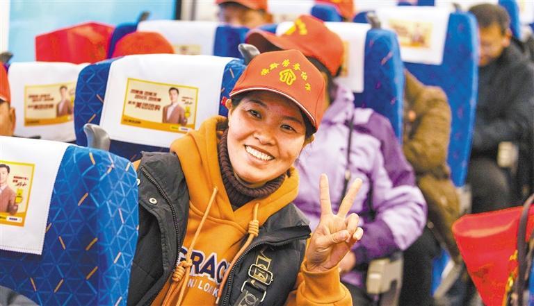 ▲2月5日,务工人员乘坐D1857次列车从贵州省黔东南苗族侗族自治州从江县前往广东省返岗务工。该列车是当地今年开行的首趟返岗就业免费动车专列。吴德军摄(中经视觉)