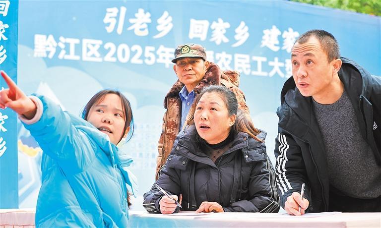 ◀2月4日,重庆市黔江区举行“引老乡、回家乡、建家乡——春暖农民工”招聘活动,200多家企业现场招聘,提供3000多个就业岗位。