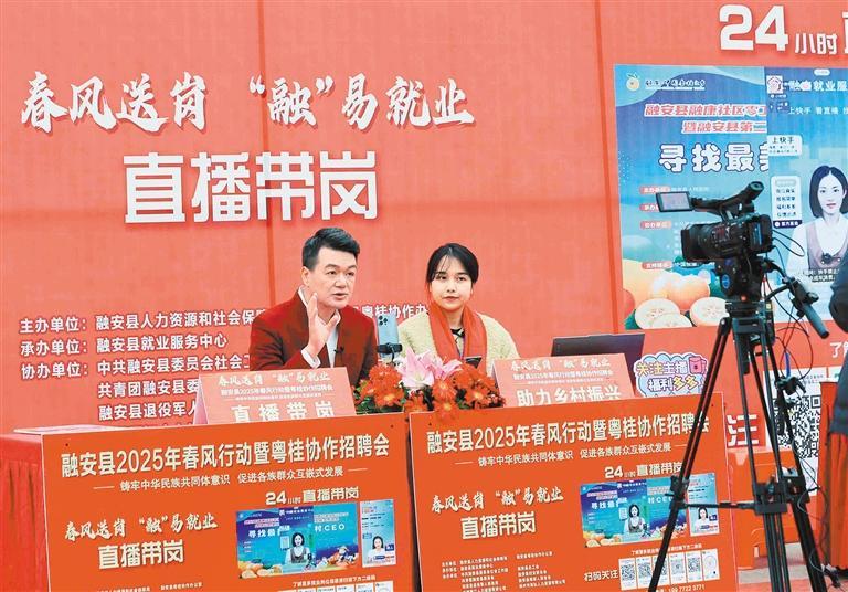 ▼2月5日,广西壮族自治区柳州市融安县长安广场,工作人员通过网络直播向求职者推介岗位。