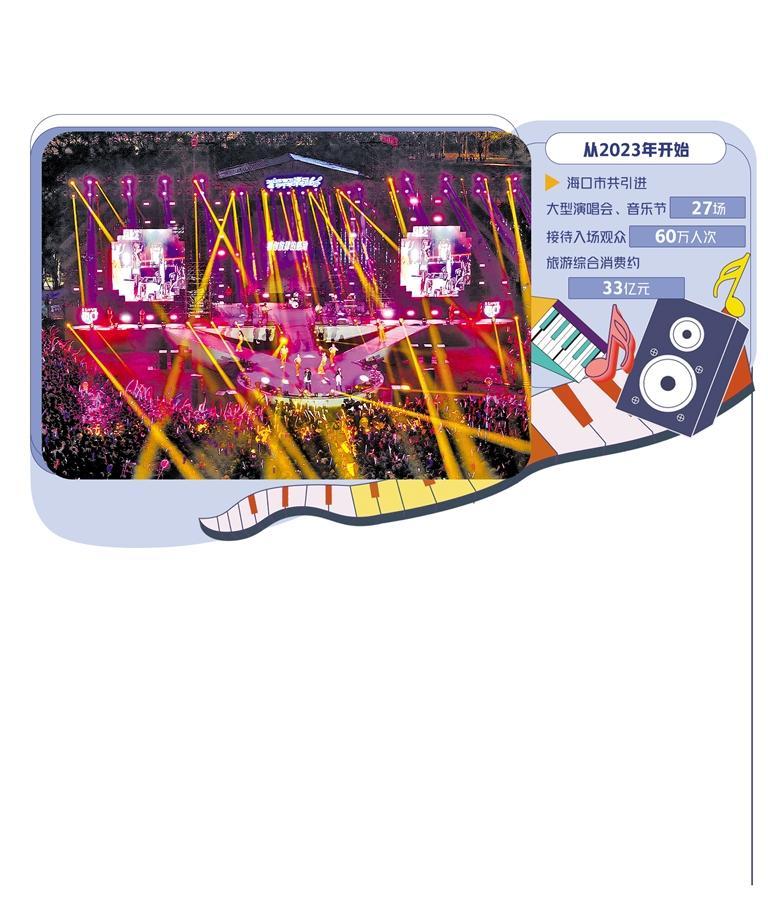 近年来,海口立足资源优势转化,通过加强引进优质演艺项目,使“国际演艺之都”的招牌越擦越亮。“从2023年开始,海口市共引进大型演唱会、音乐节27场,接待入场观众60万人次,旅游综合消费约33亿元。”海口市旅游和文化广电体育局局长王可说。