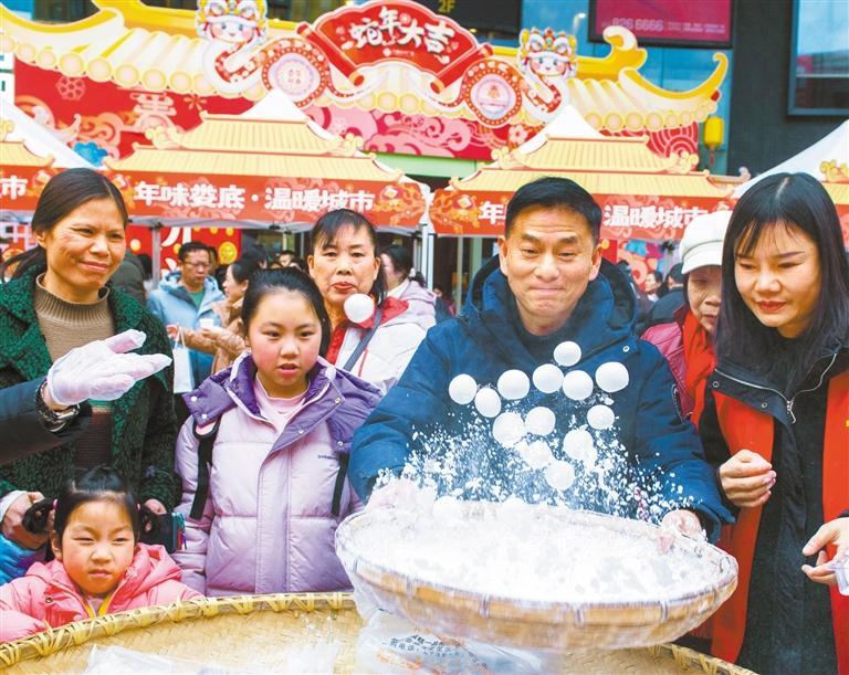 ◀2月9日,市民在湖南娄底市万豪城市广场元宵灯谜喜乐会体验摇元宵。