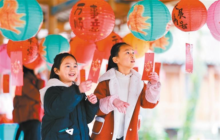 ▶2月10日,广西桂林市灵川县兰田瑶族乡西江寨,小朋友在猜灯谜。