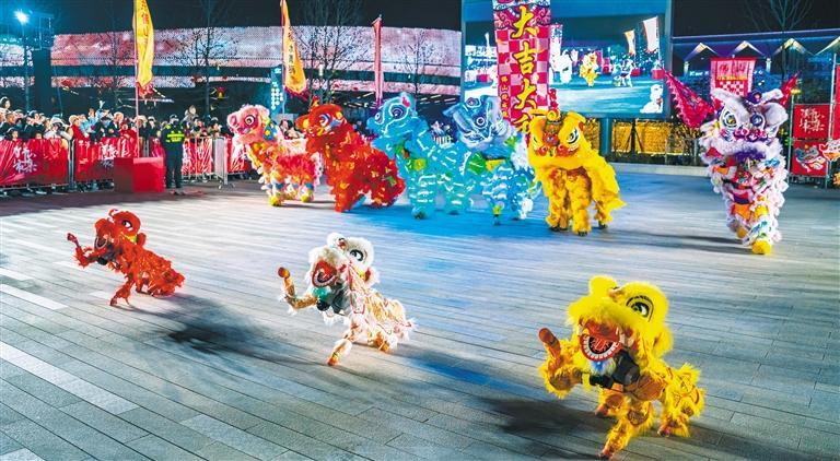 ▲2月10日,为喜迎元宵佳节,机械狗舞狮亮相江苏苏州市狮山文化广场,科技与传统碰撞,吸引众多市民游客前来观看。