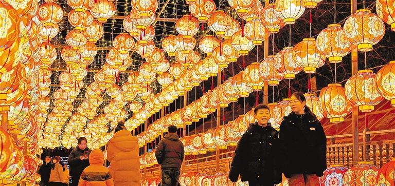 ◀2月9日晚,人们在山东枣庄市中兴国家矿山公园赏灯游玩。