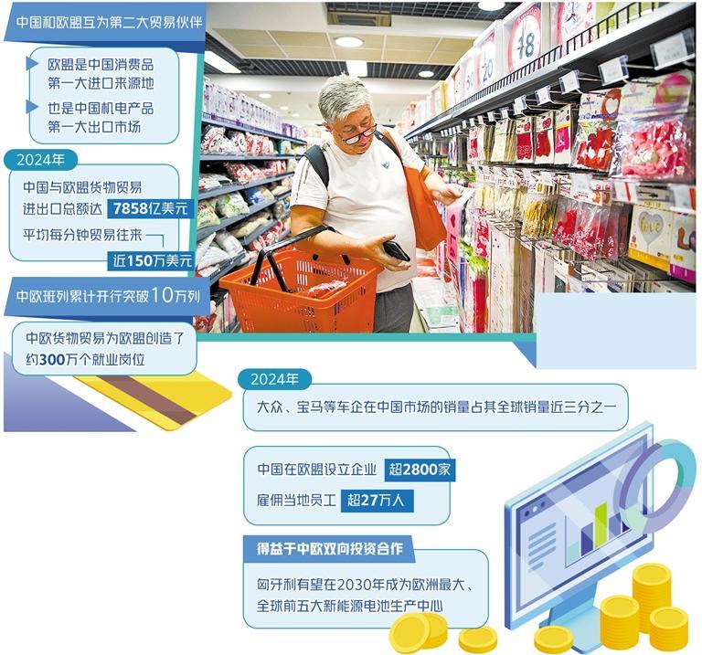 中欧携手共进,根基在于双方有着广泛深厚的共同利益。中欧合作的本质是优势互补、互利共赢,双方都是多边贸易体制的维护者,已经形成强大的经济共生关系。中国和欧盟互为第二大贸易伙伴,欧盟是中国消费品第一大进口来源地,也是中国机电产品第一大出口市场。2024年,中国与欧盟货物贸易进出口总额达7858亿美元,平均每分钟贸易往来近150万美元;中欧班列累计开行突破10万列,成为名副其实的亚欧贸易“黄金通道”。据相关统计,中欧货物贸易为欧盟创造了约300万个就业岗位,有力保障了欧洲企业的利润增长。2024年,大众、宝马等车企在中国市场的销量占其全球销量近三分之一。实践证明,中欧合作充满活力、韧性十足,深化经贸合作是大势所趋。