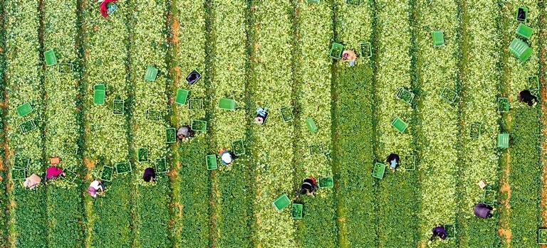 2月11日,在广西壮族自治区贺州市平桂区长龙供港蔬菜基地,工人正在加紧采收上海青。近年来,贺州市依托良好的生态资源和气候条件,持续发展壮大蔬菜产业,打造粤港澳大湾区“菜篮子”高品质生产基地,促进农业增效、农民增收,为推进乡村全面振兴注入强劲动能。黎豪图摄(中经视觉)