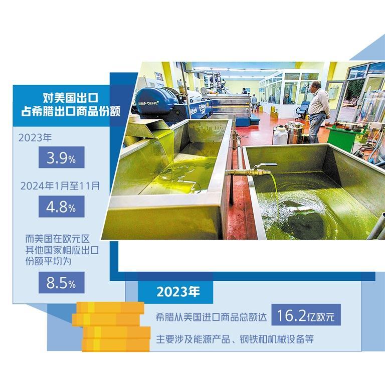 从数据来看,希腊对美出口规模在欧盟国家中并不突出。根据希腊国家银行经济分析部近期公布的数据,尽管近年来美国在希腊商品出口中的份额不断上升,但对希腊总出口的贡献仍相对较小。2023年,对美国出口占希腊出口商品份额为3.9%,2024年1月至11月期间,这一比例约为4.8%,而美国在欧元区其他国家的相应出口份额平均为8.5%,其中,爱尔兰为28.2%,意大利为10.9%,德国为9.7%。