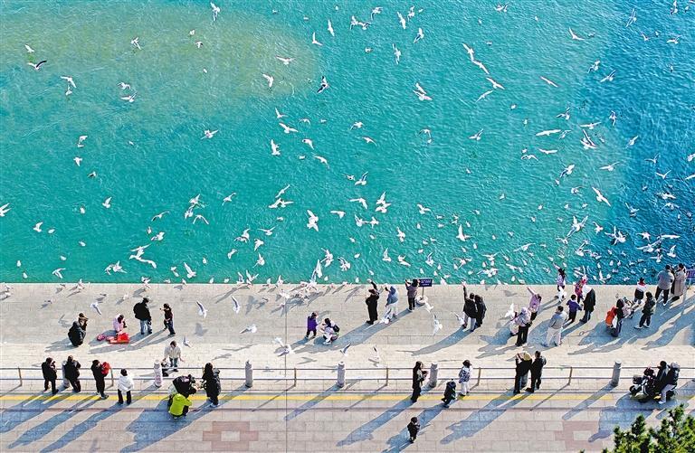 2月14日,山东省青岛市西海岸新区唐岛湾,成群海鸥在海滨翱翔、觅食,吸引了市民和游客前来观赏和喂食。近年来,随着生态环境改善,海鸥选择在唐岛湾过冬,这里成了人们与海鸥零距离接触的好地方,尽显自然之美。韩加君摄(中经视觉)
