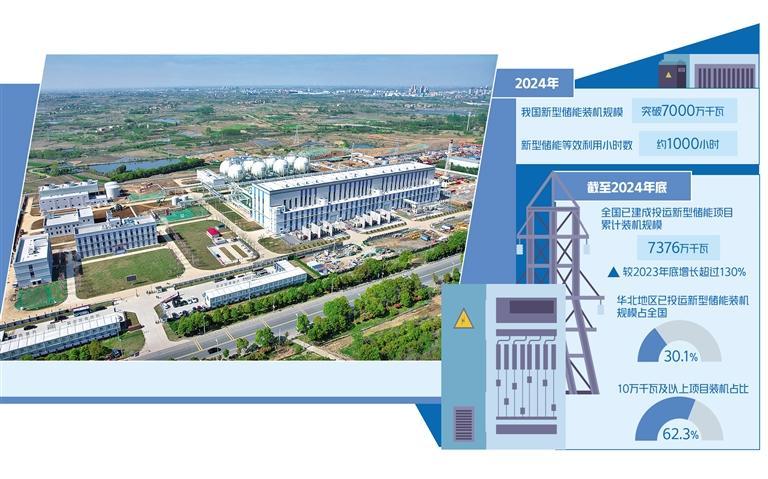 2024年,我国新型储能装机规模突破7000万千瓦。截至2024年底,全国已建成投运新型储能项目累计装机规模达7376万千瓦,较2023年底增长超过130%。新型储能调度运用水平持续提升,2024年新型储能等效利用小时数约1000小时。