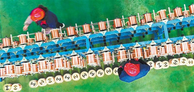 ▲2月13日,山东东营市广饶县某电缆公司生产车间,工人进行束丝作业。