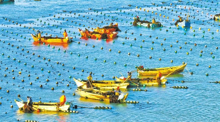2月17日,山东省荣成市爱伦湾海洋牧场,产业工人披着朝阳驾驶船只收获早期小海带。